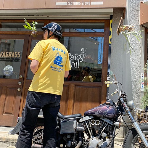 5.6ozのヘビーウエイトファブリックを使用したアメリカンクラシックスタイルのスタンダードTシャツ。オープンエンド糸を使用しふっくらとしてボリュームがあり、首まわりや袖口、裾にはダブルステッチを採用し長年ご愛用いただいても型崩れしにくいのが特徴です。左胸にはオールドスタイルパイレーツフラック、後にはパイレーツシップのプリントが施されています。