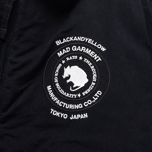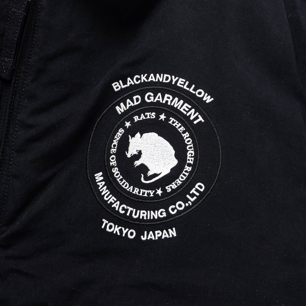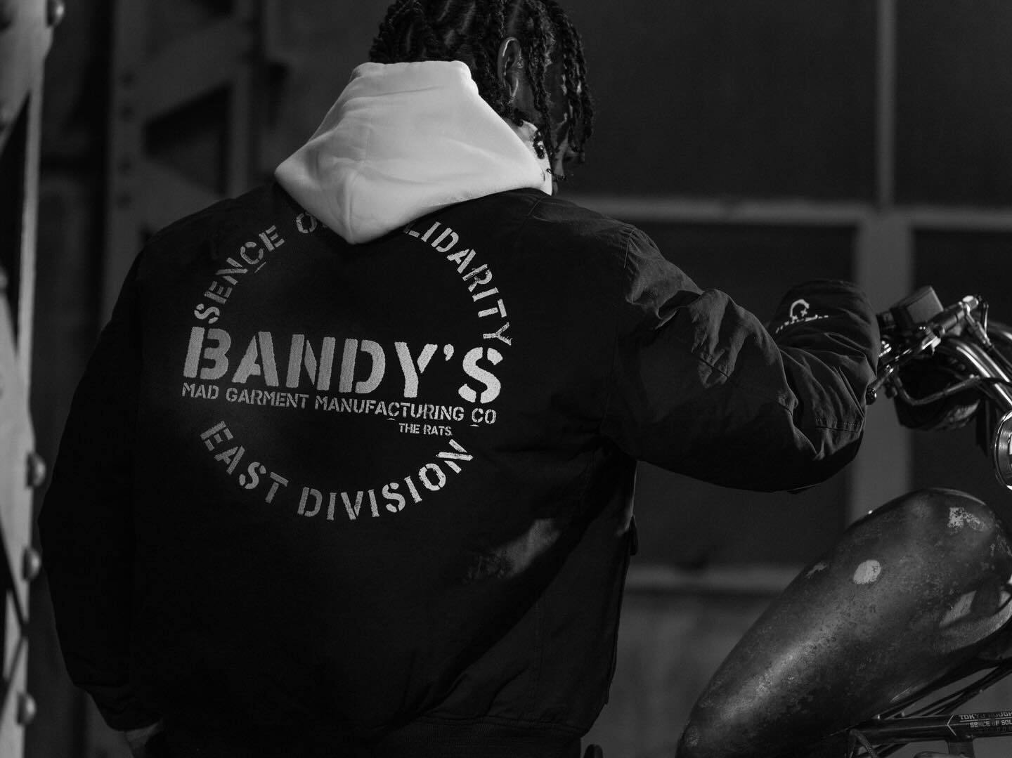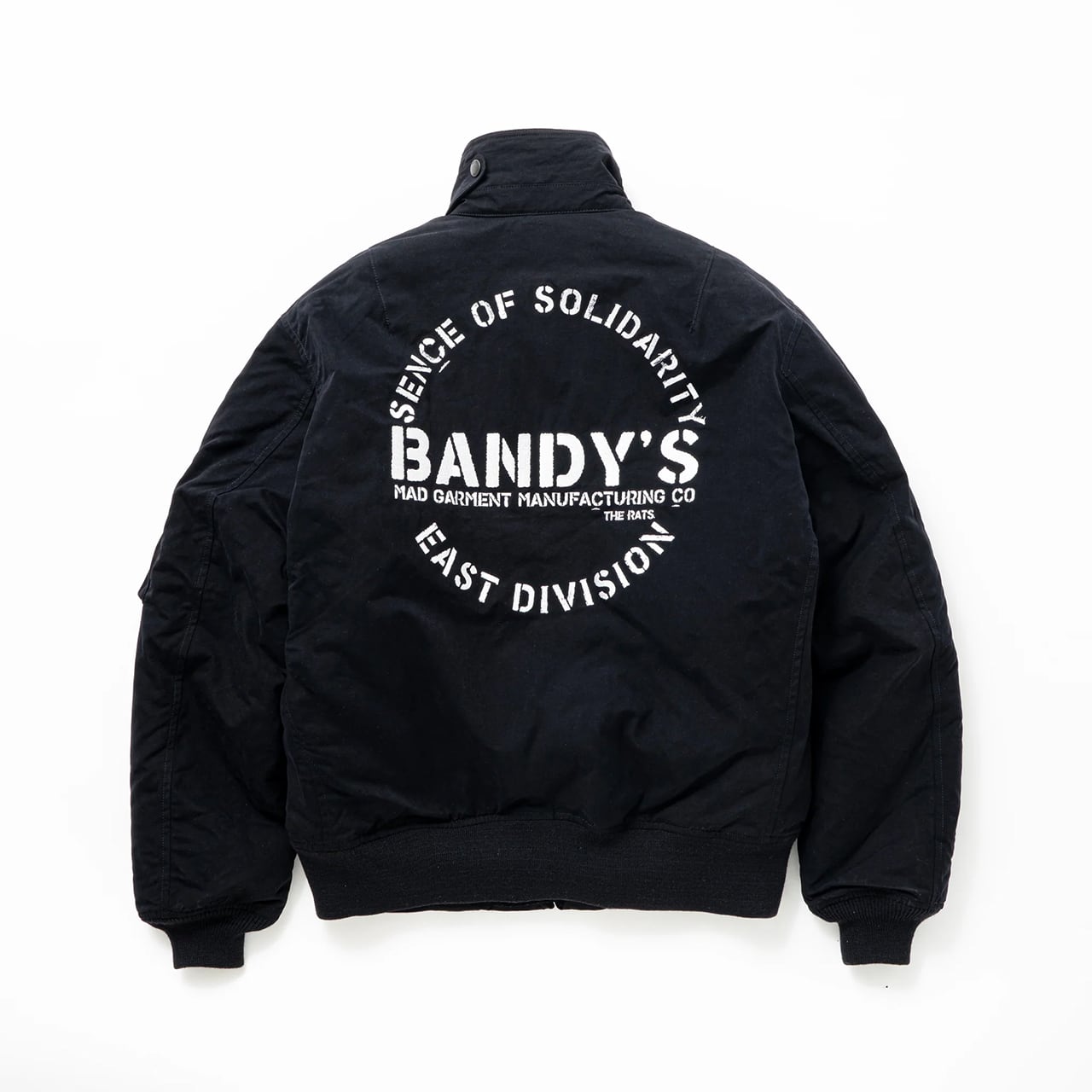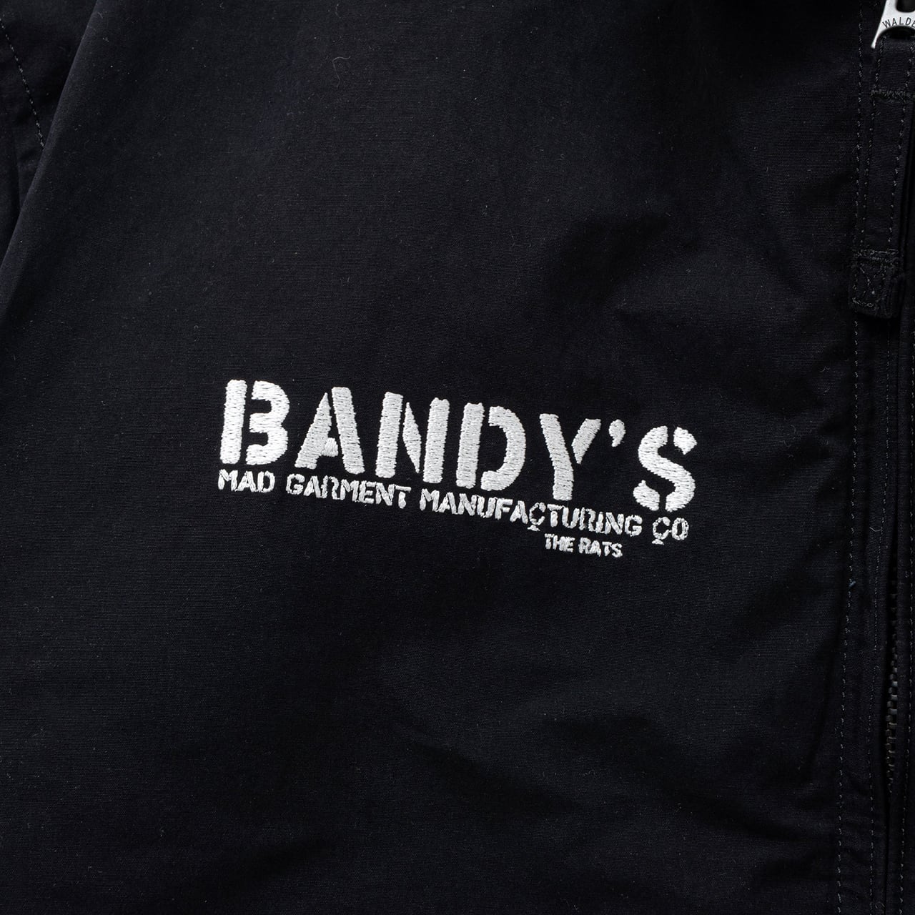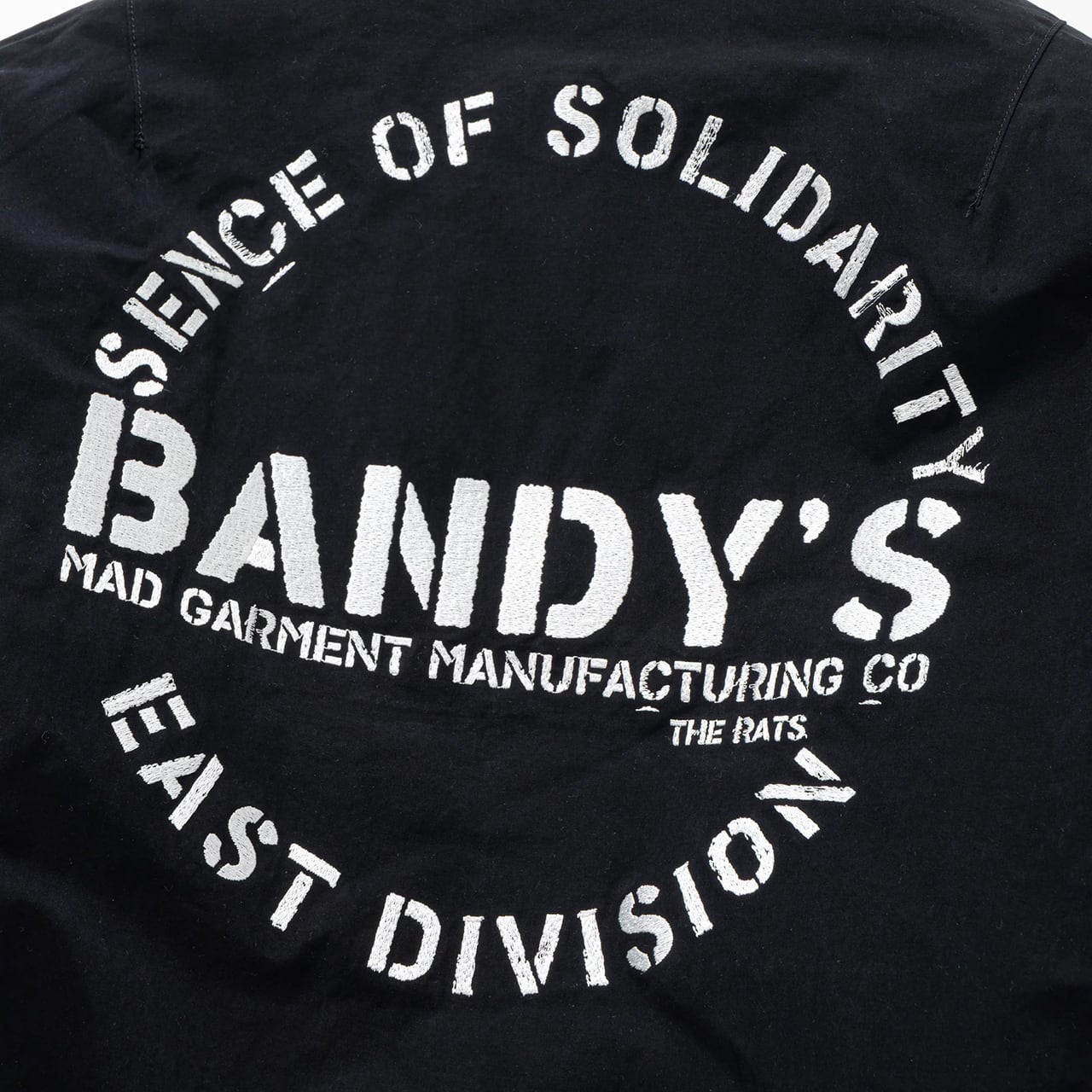 左胸にサークル型ワッペンを叩きつけ、右胸にBANDY’Sレター・背面にサークル型アートワークを直刺繍で表現するなど、RATSが掲げるメッセージやアイコンを随所に散りばめたデザイン。