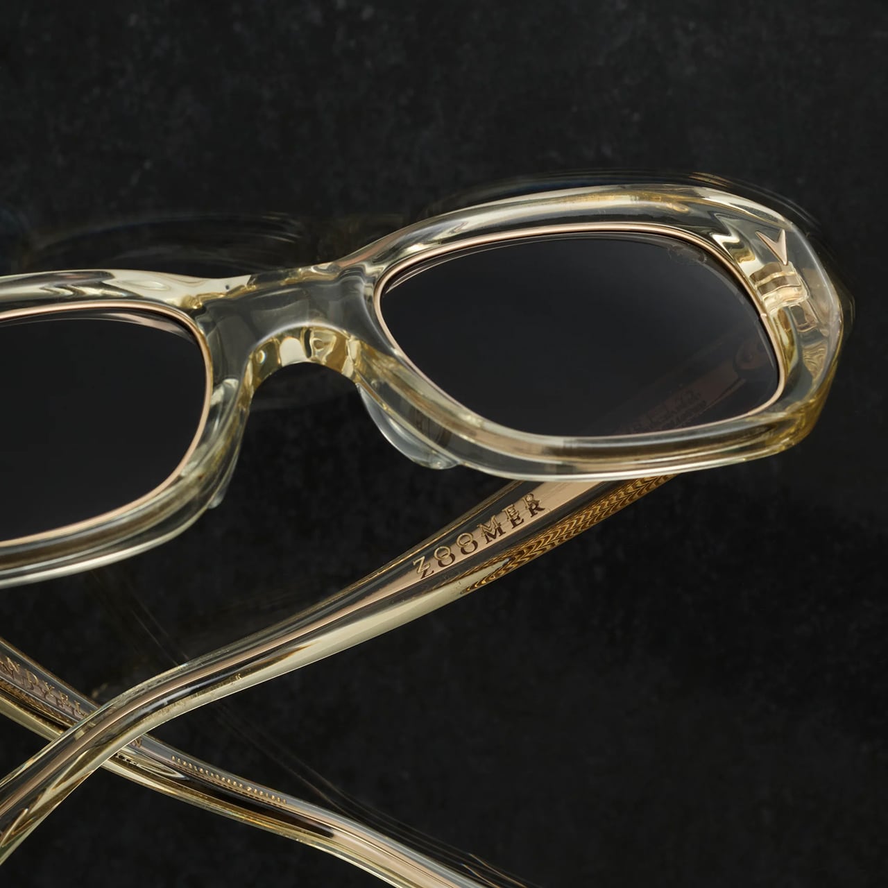フロントデザインは、1960年代のフレンチヴィンテージに見られるレンズが窪んだ仕様となっており、レンズ部分内周にメタルリムを配置させた高難易度の仕様は正に職人泣かせと言える。